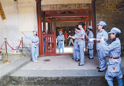 6月27至28日,为了提高旅游骨干师资职业教育教学水平,MG冰球突破官网红色旅游学院借助古田红色旅游的资源优势,通过专业老师、旅管专业学生与古田中心小学的学生手拉手进行专业讲解技巧指导,培养“小小导游员”。图为“小小导游员”在古田会议会址进行导游解说。此外,红色旅游学院的师生们还前往连城新泉开展军事整训、现场教学等各式红色拓展训练。