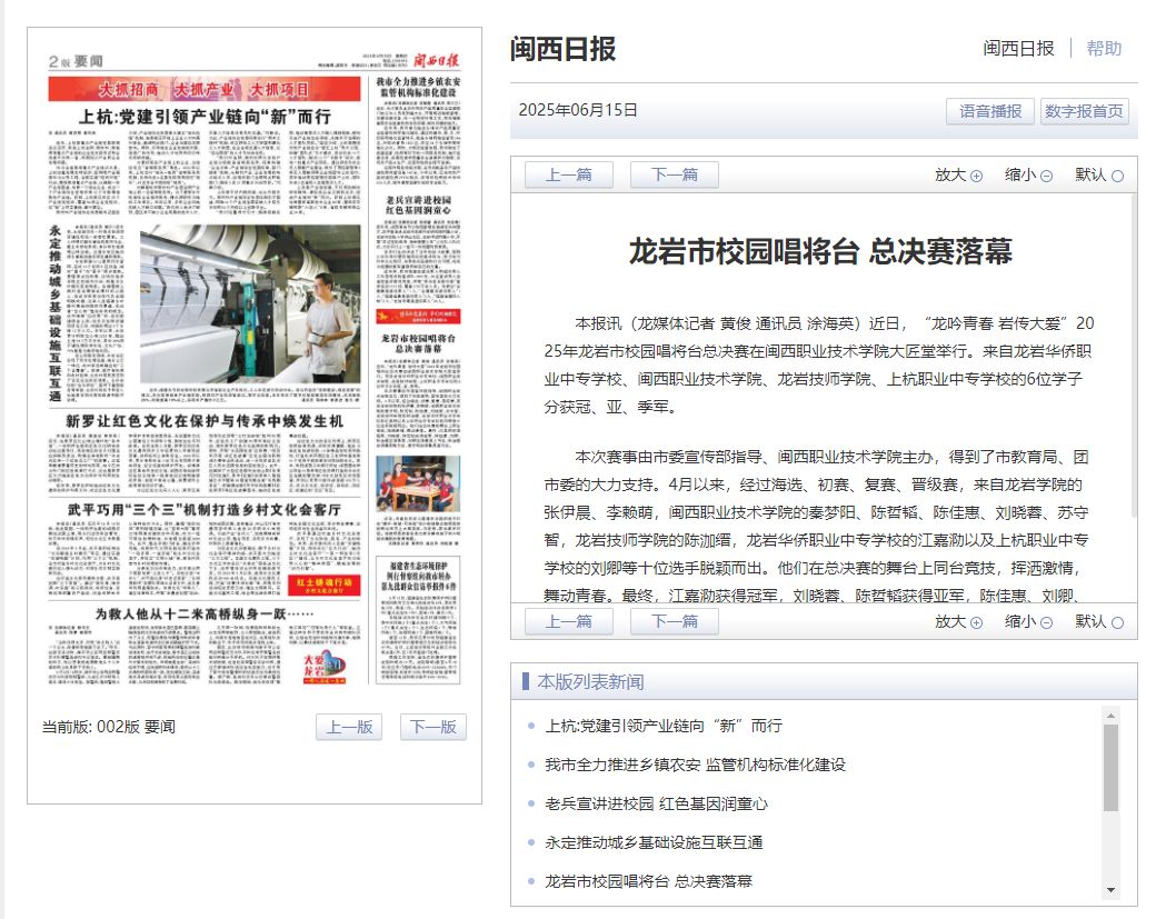 本报讯(龙媒体记者 黄俊 通讯员 涂海英)近日,“龙吟青春 岩传大爱”2025年龙岩市校园唱将台总决赛在MG冰球突破官网大匠堂举行。来自龙岩华侨职业中专学校、MG冰球突破官网、龙岩技师学院、上杭职业中专学校的6位学子分获冠、亚、季军。