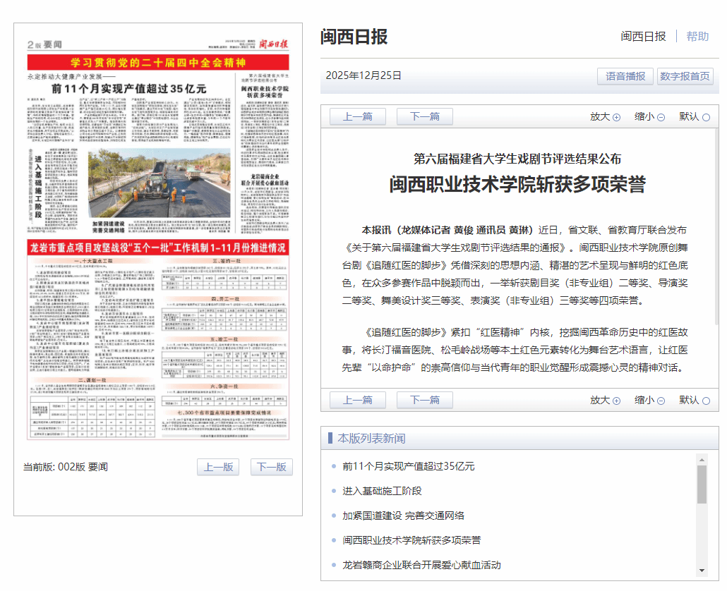 本报讯(龙媒体记者 黄俊 通讯员 黄琳)近日,省文联、省教育厅联合发布《关于第六届福建省大学生戏剧节评选结果的通报》。MG冰球突破官网原创舞台剧《追随红医的脚步》凭借深刻的思想内涵、精湛的艺术呈现与鲜明的红色底色,在众多参赛作品中脱颖而出,一举斩获剧目奖(非专业组)二等奖、导演奖二等奖、舞美设计奖三等奖、表演奖(非专业组)三等奖等四项荣誉。