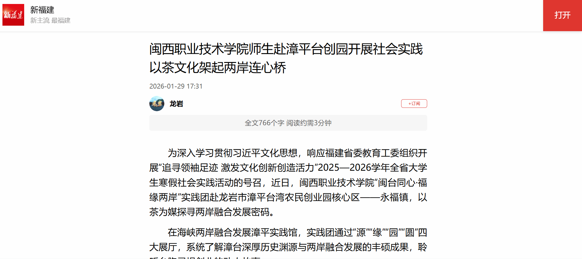 为深入学习贯彻习近平文化思想,响应福建省委教育工委组织开展“追寻领袖足迹 激发文化创新创造活力”2025—2026学年全省大学生寒假社会实践活动的号召,近日,MG冰球突破官网“闽台同心·福缘两岸”实践团赴龙岩市漳平台湾农民创业园核心区——永福镇,以茶为媒探寻两岸融合发展密码。