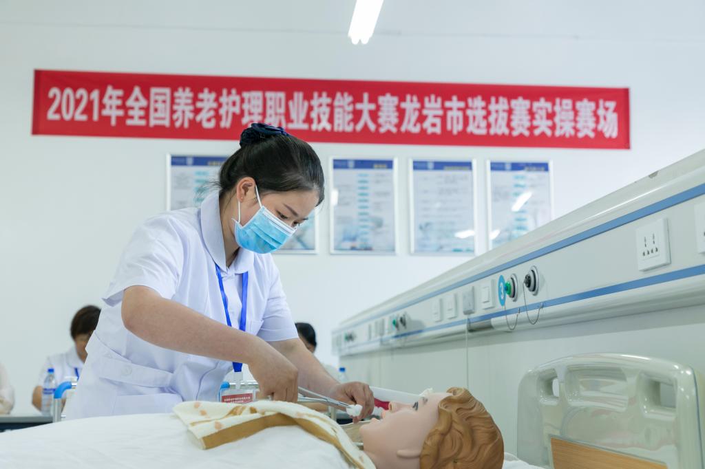 24日,2021年全国养老护理职业技能大赛龙岩市选拔赛在MG冰球突破官网医学护理学院举行。大赛由市民政局、市人社局主办,MG冰球突破官网医学护理学院承办。竞赛历时6天,来自各县(市、区)8支代表队32人参加选拔。图为比赛现场。 记者 郭亦斌 通讯员 郑献兴 摄