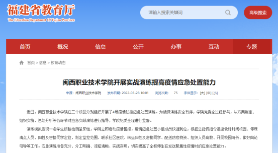 演练模拟发现一名学生核酸检测呈阳性,学院立即启动疫情警报,疫情应急处置小组成员快速到位,根据总指挥指令迅速做好封闭校园、停课清点人员、阳性及密接同学定位、划定监控范围、联系社区医院、转运阳性及密接同学、配送防疫物资、组织人员疏散、开展校园消杀、做好舆论引导等工作。应急演练准备充分、分工明确、流程清晰、实战实用,切实提高了全校师生在发送聚集性疫情时的应急处置能力。