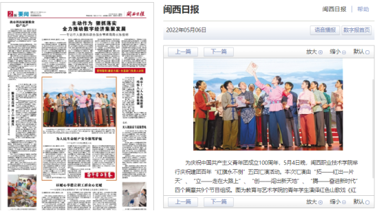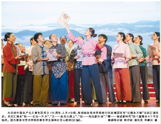 为庆祝中国共产主义青年团成立100周年,5月4日晚,MG冰球突破官网举行庆祝建团百年“红旗永不倒”五四汇演活动。本次汇演由“拓——红出一片天”、“立——走在大路上”、“创——闯出新天地”、“腾——奋进新时代”四个篇章共9个节目组成。图为教育与艺术学院的青年学生演绎红色山歌戏《红嫲》。