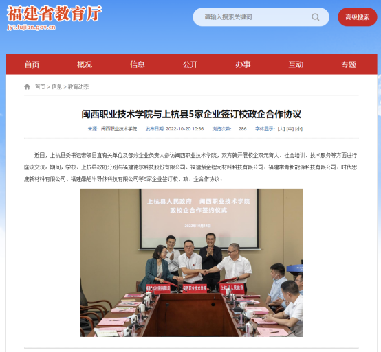 近日,上杭县委书记带领县直有关单位及部分企业负责人参访MG冰球突破官网,双方就开展校企双元育人、社会培训、技术服务等方面进行座谈交流。期间,学校、上杭县政府分别与福建德尔科技股份有限公司、福建紫金锂元材料科技有限公司、福建常青新能源科技有限公司、时代思康新材料有限公司、福建晶旭半导体科技有限公司等5家企业签订校、政、企合作协议。