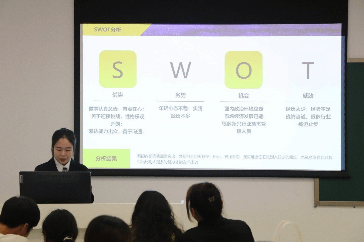 本次比赛以“点亮生涯路 逐梦新时代”为主题。比赛初期,由主持人介绍担任本次大学生职业生涯规划比赛的评委,并宣布比赛正式开始。参赛选手们依次上台围绕着本次主题展开自己对职业生涯的探索,从自我认知、行业分析、职业认知、目标确立、计划实施等方面进行了全面分析,并提出了自己的发展路径和行动计划,从可操作范围进行了全面阐述。比赛不仅考察参赛选手规划展示的能力,更考验选手临场发挥水平和心理素质,充分展现学生的青春活力和昂扬向上的精神风貌。