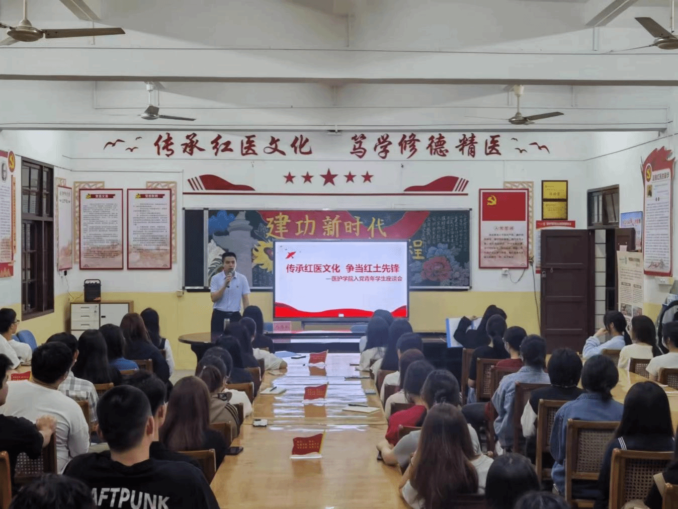 近日,医护学院在红土初心讲堂召开入党青年学生座谈会,座谈会由院党委负责人邱伟彬主持,全体在校入党青年学生共计170人参加。