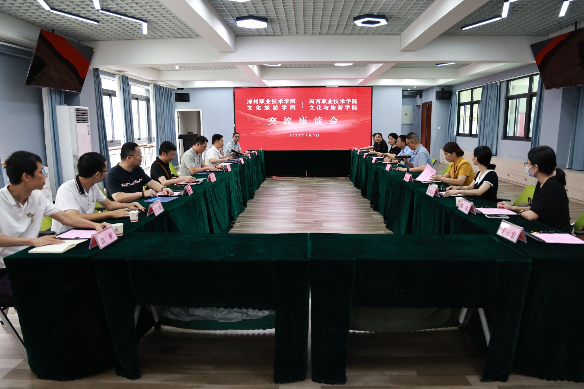 随后,双方进行了交流座谈。胡志超院长介绍了漳职院文化旅游学院的办学特色、办学成绩、专业建设等情况。文化与旅游学院负责人对漳职院文化旅游学院的热情接待表示了感谢,并介绍了我院的办学情况。会上双方围绕文旅专业融合建设、产教融合建设、技能大赛杯赛管理、横向课题管理以及“校企双元育人”教学改革等方面展开了深入交谈,并对以后继续加强相互学习、交流达成共识。