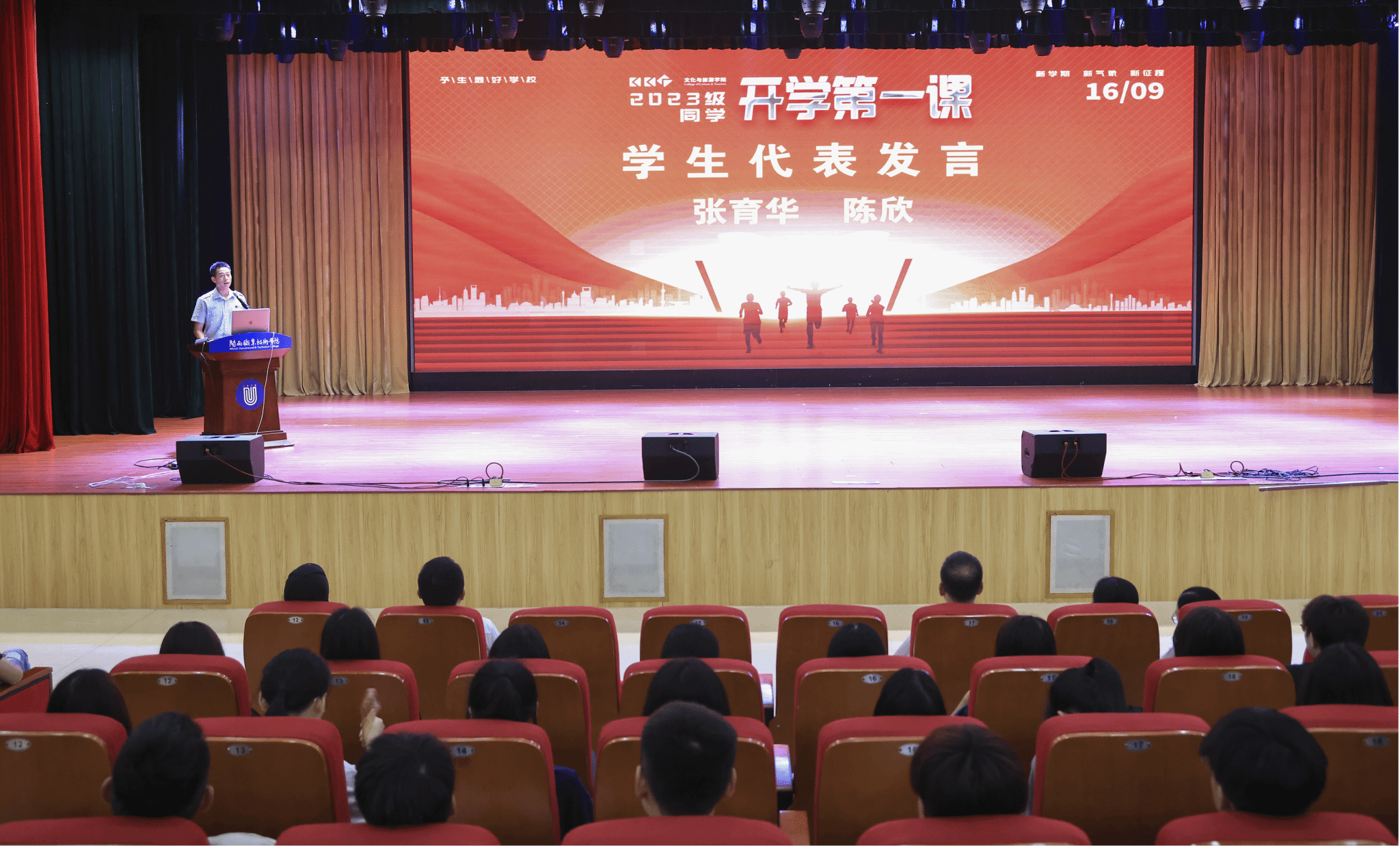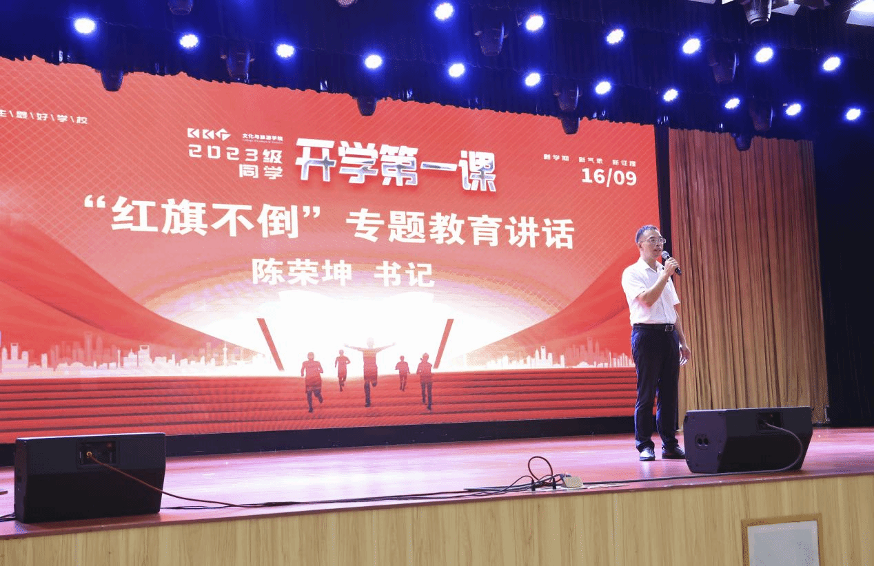 庄严的音乐响起后,全体师生起立共唱国歌,在振奋而激动的氛围中正式开启“开学第一课”。学院党委书记陈荣坤上台作“红旗不倒”专题教育讲话,首先向全体新生的到来表示热烈的欢迎,号召全体新生向革命前辈学习,自信担当、积极进取、勇于拼搏,祝福大家度过愉快的、有意义的大学时光,努力成为一技在手的新时代阳光工匠。
