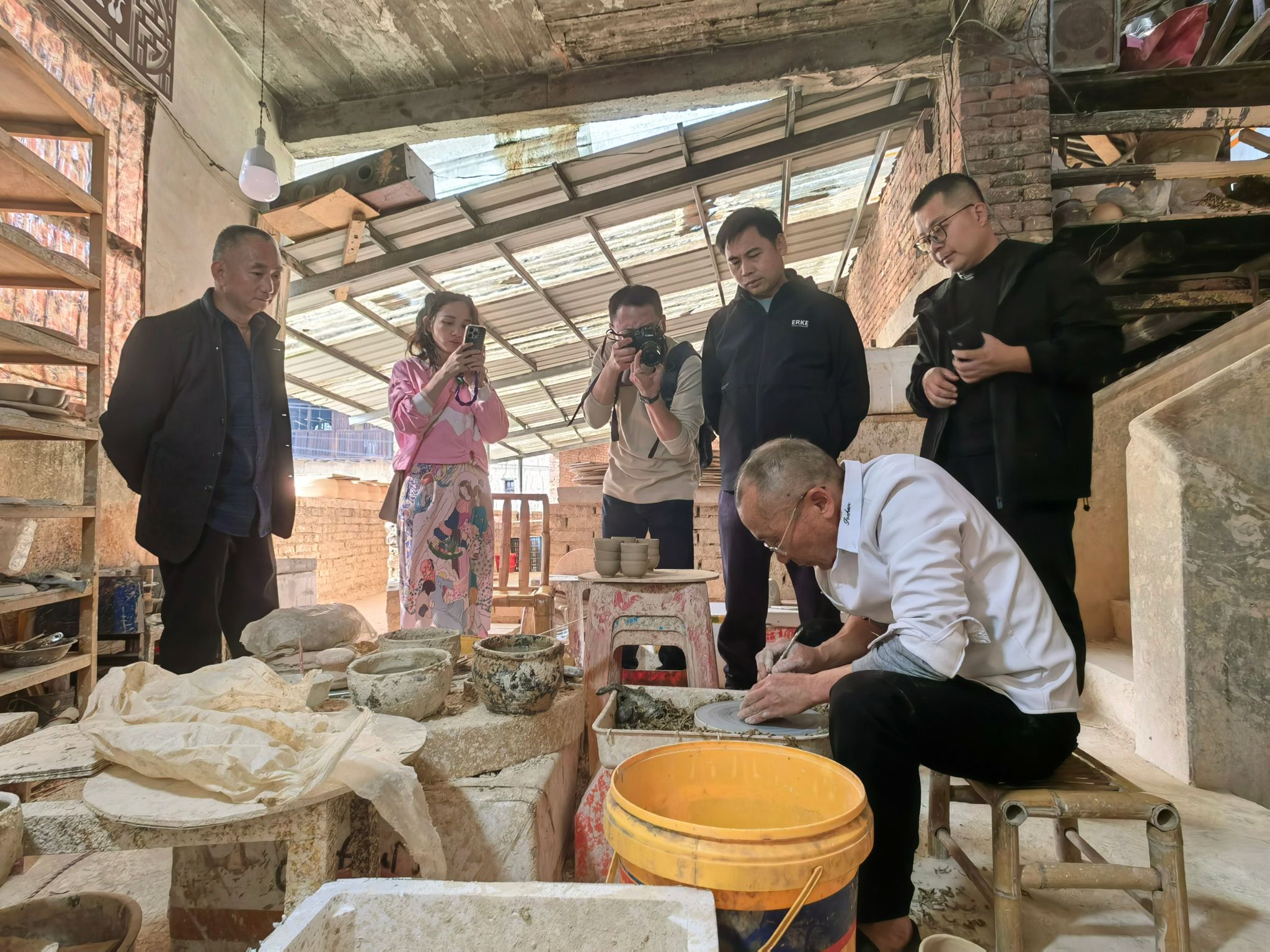 文旅学院一行细致考察了“古竹陶罐”的整个工艺流程,与传承人进行了深入的交流与探讨,抱着学习的态度虚心请教,站在学术角度和商业角度提出切实可行的建议,并就此项目开展研学实训以及建设大师工作室等内容达成初步合作意向。