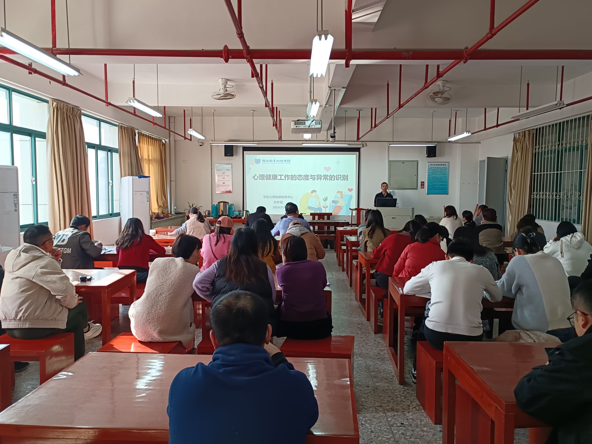 为进一步了解当代大学生常见心理问题、心理疾病的特点、症状、成因及处置对策,着力提升全体教职工思政教育能力和水平,切实增强教职工队伍工作的针对性和实效性,2024年1月16日,文化与旅游学院邀请MG冰球心理咨询中心杜梦霞老师在万源楼702教室对该院全体专业教师、辅导员、班主任和训导师开展了以《心理健康工作的态度与异常的识别》为主题的培训讲座。