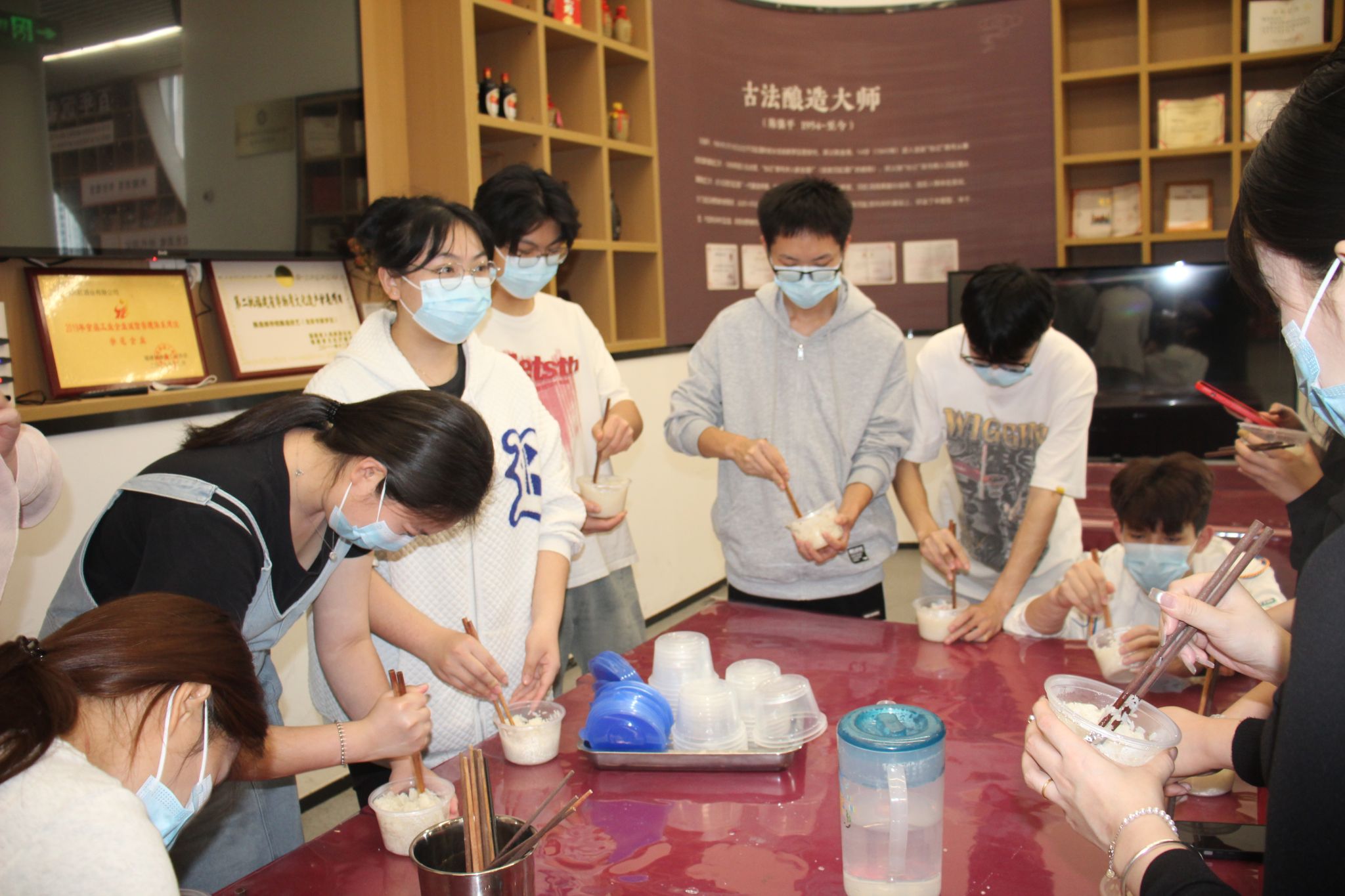 学生认真聆听了沉缸酒的发展历史、制酒原料、生产工艺,品尝了红曲酒、青梅酒、沉缸酒,并使用馆内器具亲手制作了糯米酒,沉浸式体现沉缸酒的古法技艺与文化。