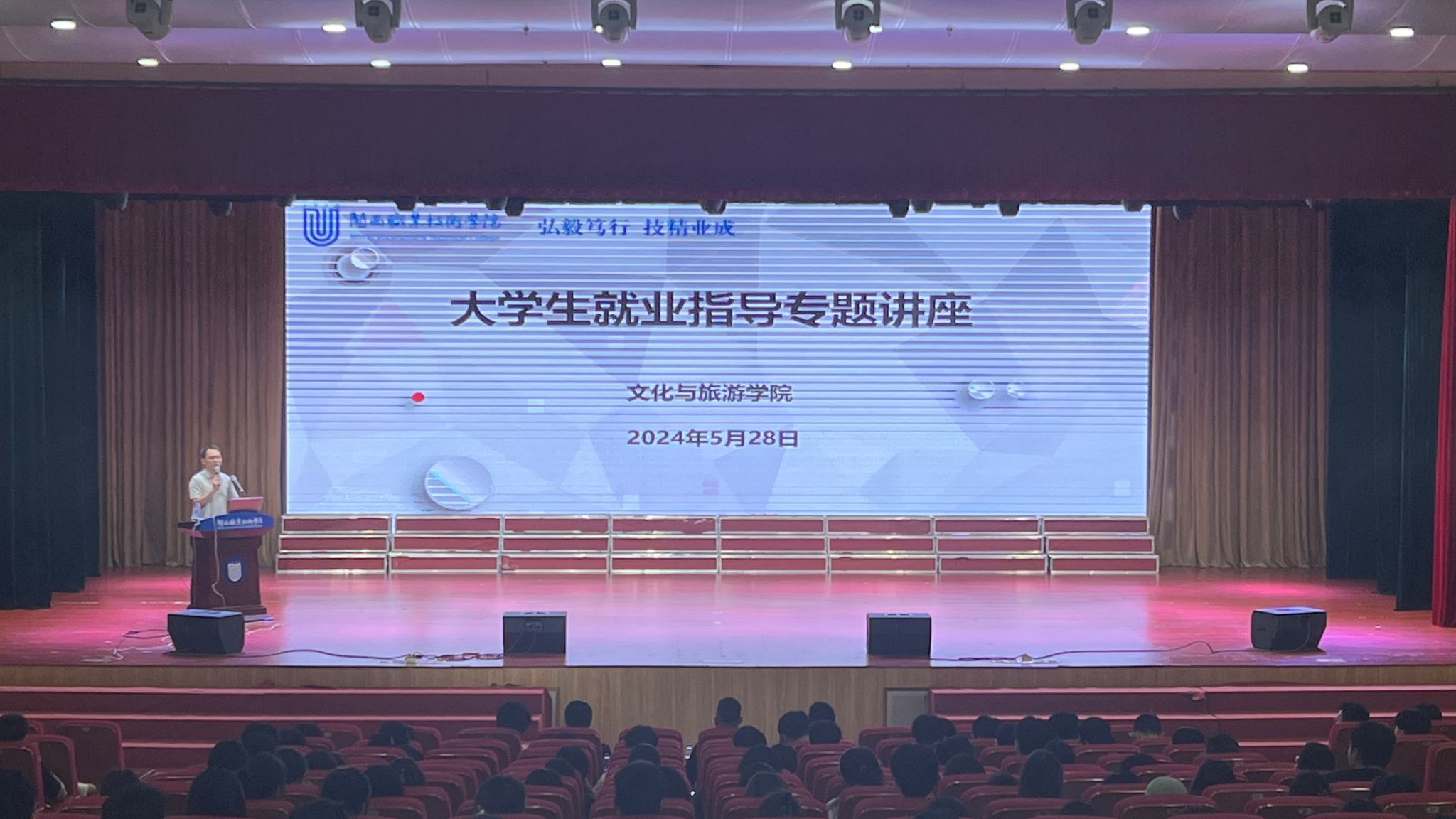 在当前就业形势日益复杂多变的背景下,为有效提升我院学生的职业规划意识和就业竞争力,文化与旅游学院于2024年5月28日下午在大匠堂成功举办了“大学生就业指导专题讲座”。本次讲座邀请了2014届旅游管理涉外班优秀校友代表詹杨男围绕就业经历、工作经验、职业规划与发展路径等主题进行了深入浅出的讲解与分享,22级全体学生共计750余人参加了本次专题讲座。