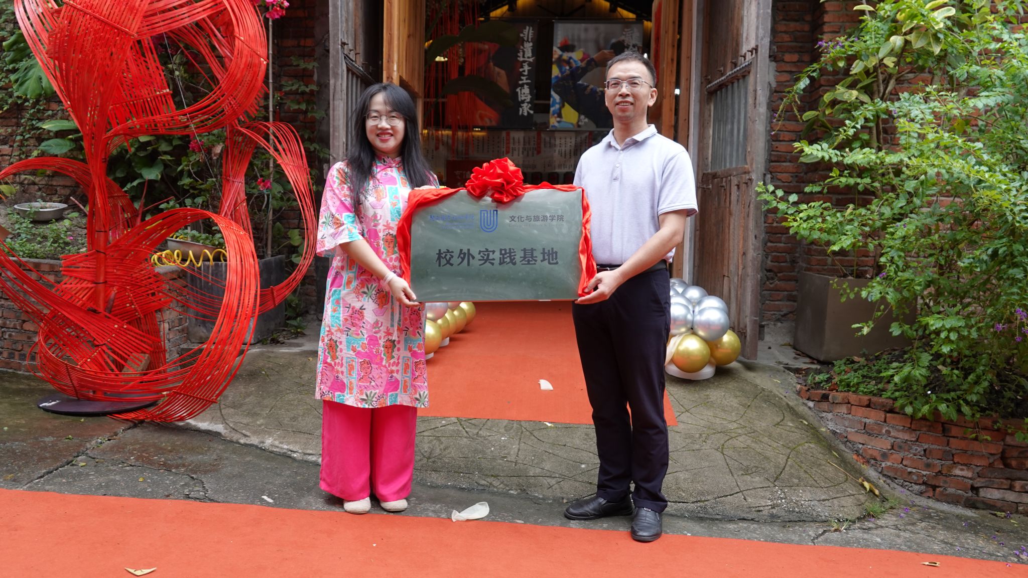 9月22上午,文化与旅游学院校外实践基地授牌仪式在“岩城敘在地风物馆”举行,学院党委书记、相关教师参加了仪式。仪式上,文化与旅游学院党委书记将“校外实践基地”牌匾授予岩城敘在地风物馆负责人,双方将在促进非物质文化遗产保护、传承与发展方面展开深入的合作,这不仅为学院增添了一处重要的校外实训基地,也为开展校企合作非遗文创方向搭建了崭新的平台。
