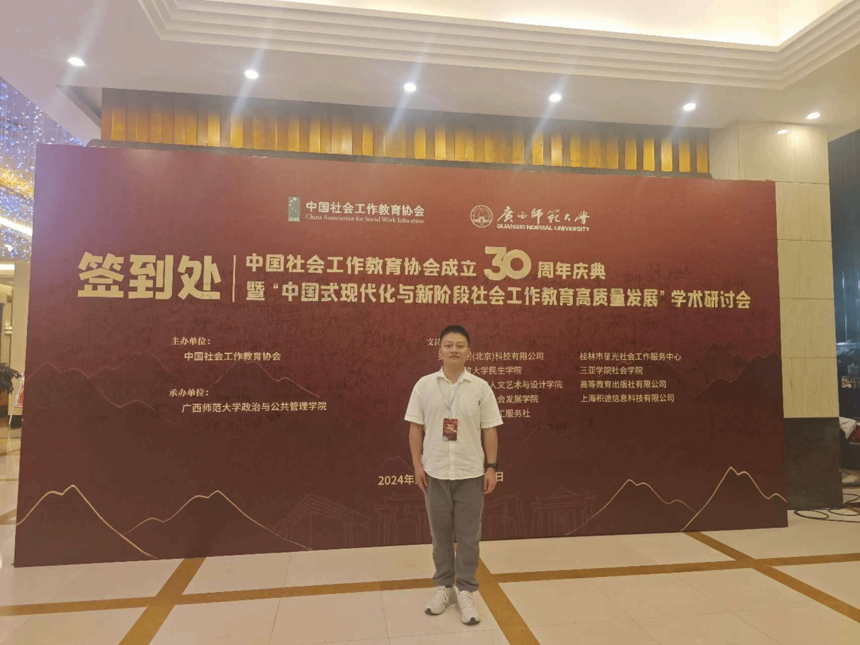 2024年11月8日至10日,由中国社会工作教育协会主办,广西师范大学承办的“中国社会工作教育协会成立30周年纪念暨中国式现代化与新阶段社会工作教育高质量发展”学术研讨会在广西桂林市隆重召开。来自全国各地的专家学者、高校教师、社会工作从业者等齐聚一堂,共同探讨中国式现代化背景下社会工作教育的未来发展方向。