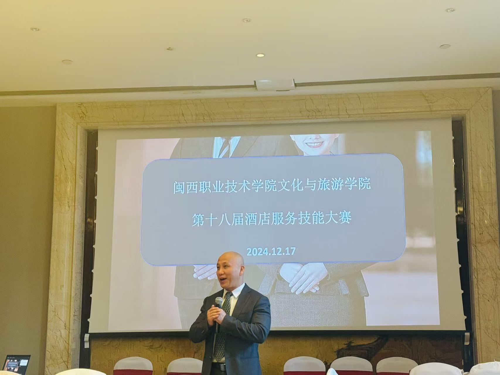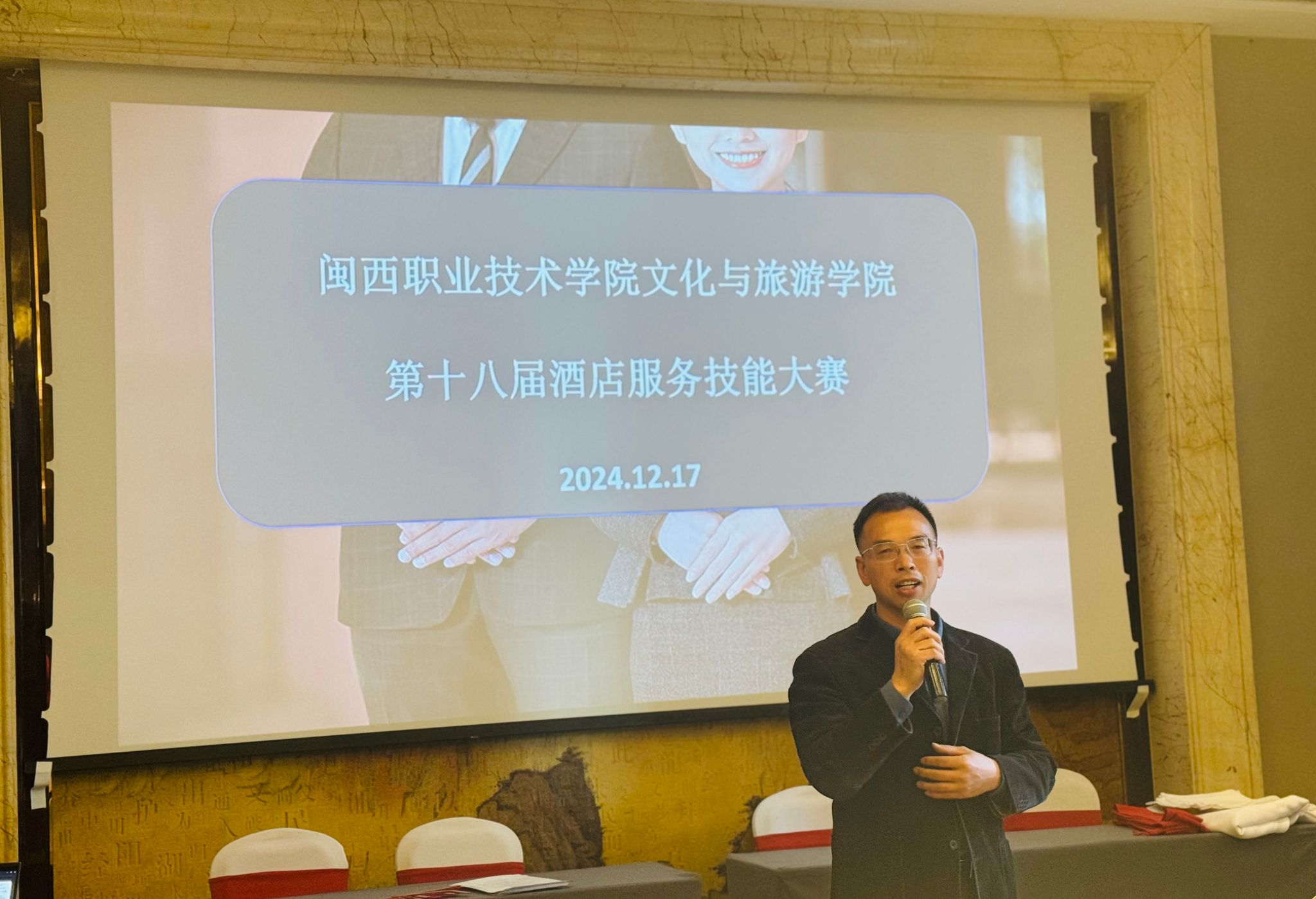 在开场致辞中,文化与旅游学院党委书记对大赛的顺利举办表达了深切的期许,话语中充满对学生的鼓励,并对龙岩富力万达嘉华酒店的支持表示诚挚的感谢。龙岩富力万达嘉华酒店李晨宇总经理对大赛给予了高度评价,并表达了对未来深度合作的期待。