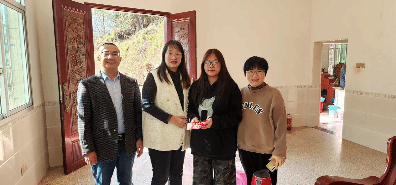 为深入贯彻党的二十届三中全会精神,进一步加强家校联系,凸显“精准资助、资助育人”成效,落实《关于深化开展高校资助育人“三行”教育活动的通知》《财经商贸学院家校联系制度(试行)》等文件精神,财经商贸学院党委书记郭玲娜、党委副书记邓连文、网络营销与直播电商专业主任陈玉章、兼职辅导员李琴一行四人,于2025年1月23日亲临2024级网络营销与直播电商3班林洁同学的家中进行寒假家访慰问活动。