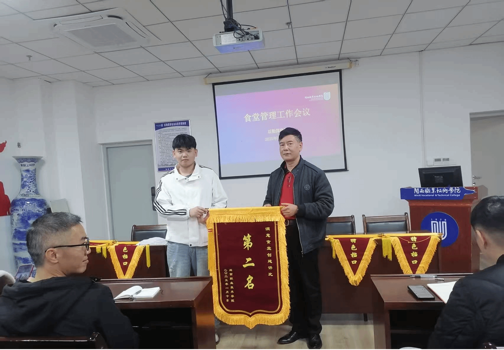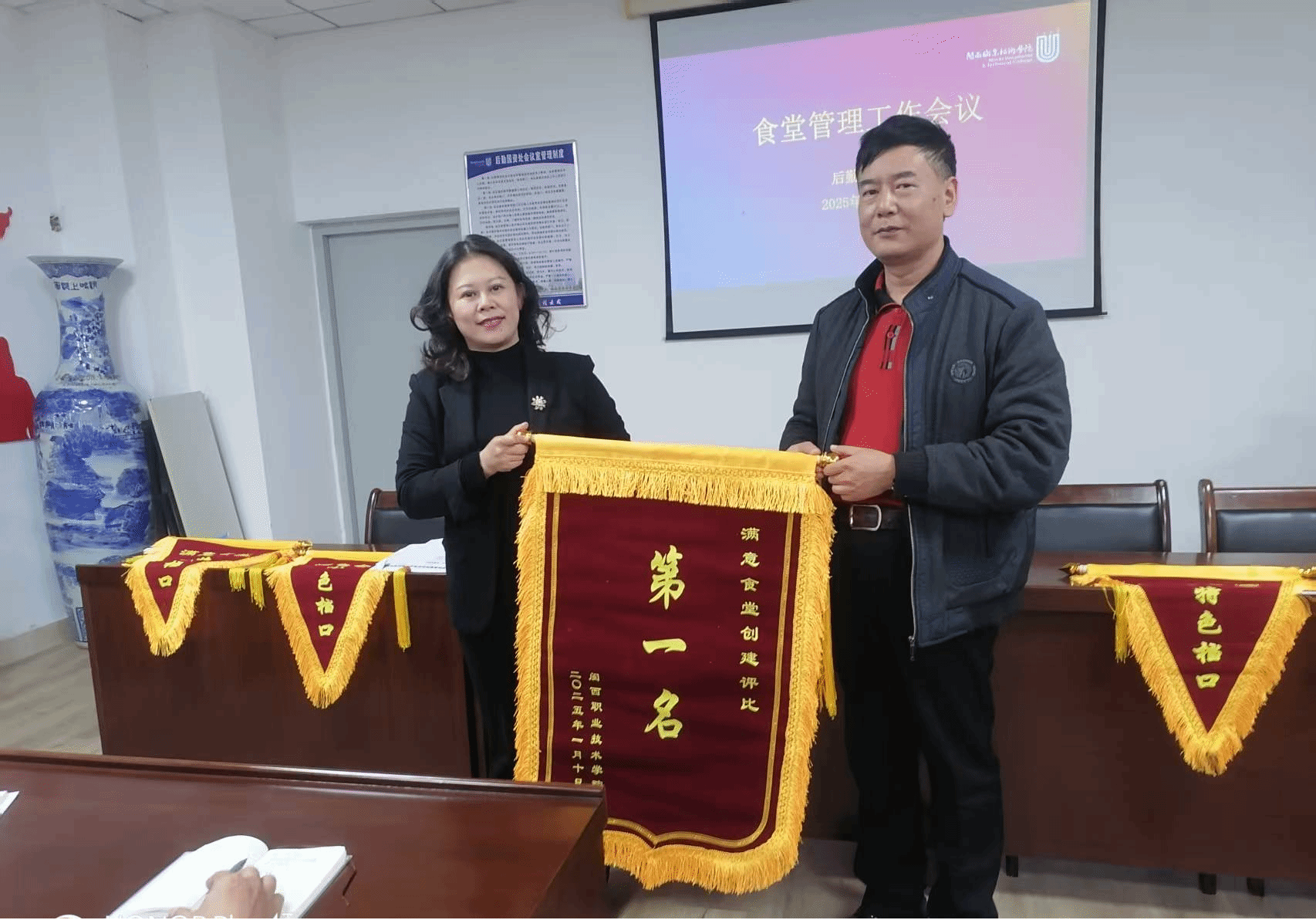 随后,陈文龙副处长通报了2024—2025学年第一学期 “满意食堂创建”评选结果,鼓励大家向榜样看齐,比学赶超,在今后工作中不断改进、提升,再创佳绩,并为获奖食堂、档口颁发了锦旗。