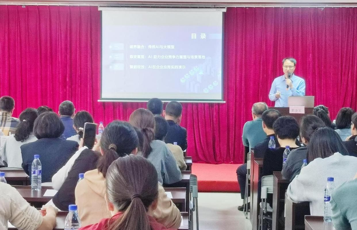 本次培训邀请了MG冰球突破官网信息工程学院计算机技术应用专业的学科带头人郭金文老师担任主讲。郭老师曾在锐捷、网龙、金山云等知名企业担任系统架构师,具备深厚的专业技能与丰富的人工智能领域实战经验。培训会上,郭老师聚焦AI技术在企业领域的创新应用,以《AI赋能,助力企业革新发展——AI大模型在企业应用场景》为主题,从“破界融合:传统AI与大模型”、“裂变重塑:AI助力企业竞争力重塑与场景落地”、“聚能绽放:AI在企业应用实践”三个方面展开深入讲解。此外,他还精心设置了实践演示环节,现场展示DeepSeek在生成企业调研方案、企业汇报PPT、产品宣传视频以及打造智能客服、3D数字人等方面的强大功能和实际应用,让参会人员直观感受到AI技术的强大魅力。