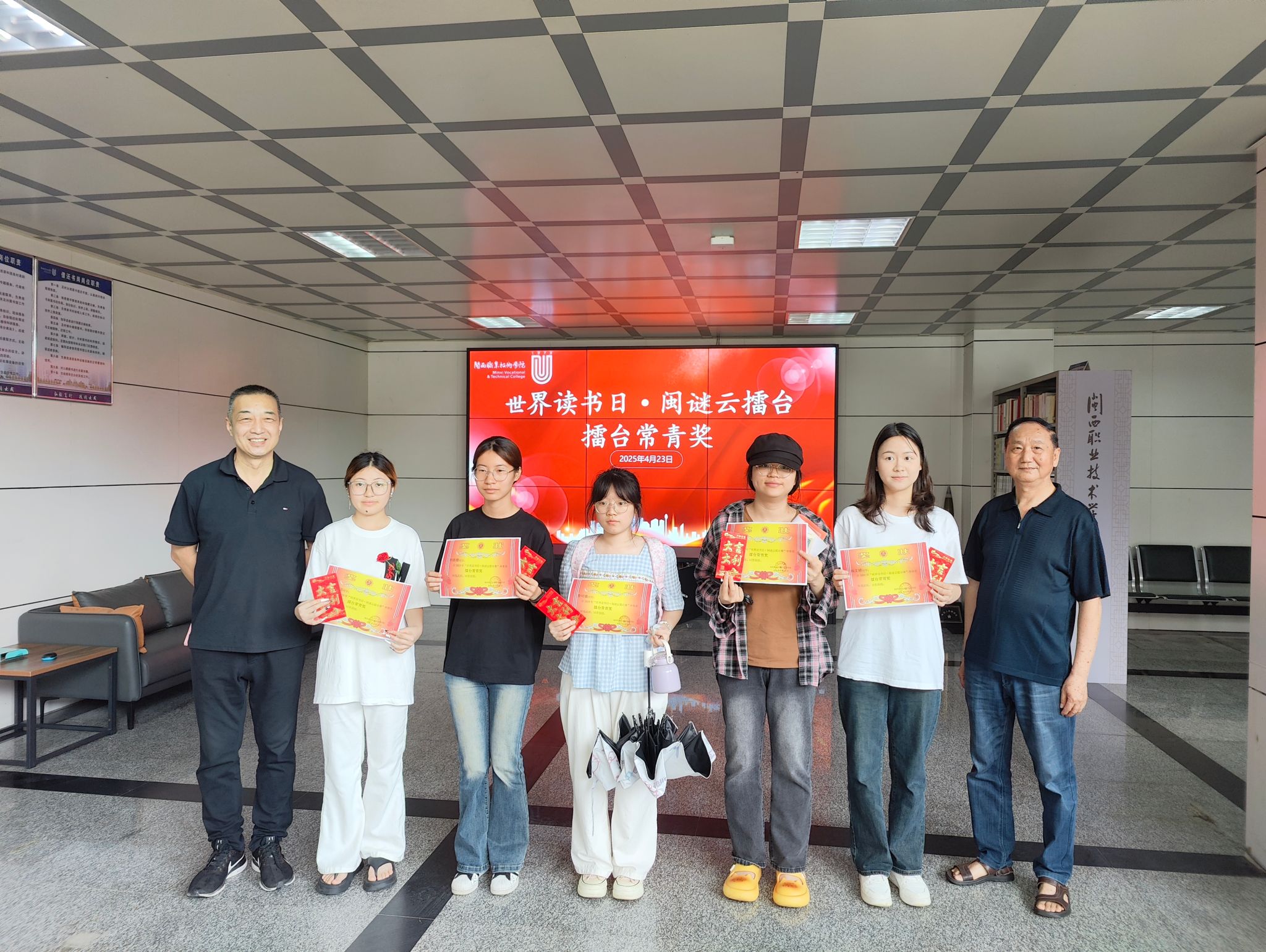 4月23日上午,图书馆负责人在图书馆服务大厅为“爱心传递・书香漫渠”捐书活动的宣传大使们颁发聘书,感谢他们为书香传递贡献力量。同时,为期15天的闽谜云擂台赛圆满落幕,杨文婷等10名同学凭借出色表现荣获 “常青奖”。
