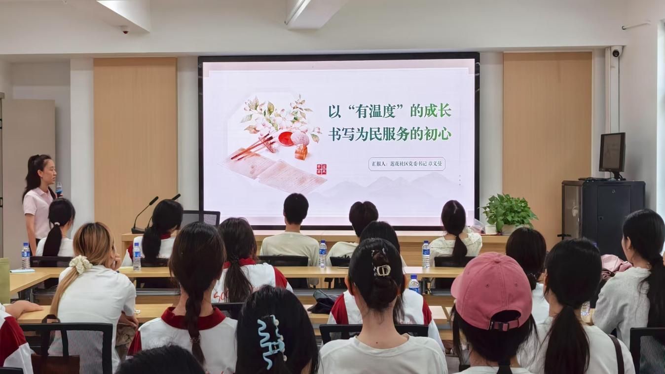 接下来,大家前往莲花社区党群服务中心了解社区的发展和建设情况,在章书记深入浅出的讲解中进一步学习社区的工作方法和经验,在饱含深情的故事分享中感受社区工作的温度与为民服务的初心。最后,在“青年圆桌派•智汇议治理”的交流环节,社区书记和社区工作人员与学生们亲切互动,积极听取青年学子对社区建设的建议,并耐心为学生们答疑解惑。
