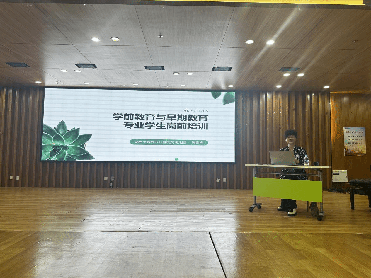 11月5日,人文与社会发展学院为师范类专业学生量身打造的岗前培训正式开讲。本次培训特邀学院客座教授、龙岩市区直机关幼儿园吴白桦园长主讲,为即将步入实习岗位的“准教师”们传经送宝,助力其快速适应职业角色。