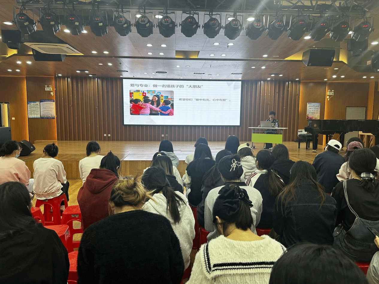 培训中,吴园长围绕五大核心维度展开实操性分享:以“转变与定位”为起点,引导学生完成从“学生”到“准幼师”的角色认知切换;聚焦“安全与底线”,强调幼儿园安全工作的核心地位,叮嘱学生坚守职责、守护幼儿生命安全;以“爱与专业”为核心,传授读懂幼儿心理、构建良好师幼关系的实践方法;以“任务与成长”为导向,鼓励学生珍惜实习契机,在实践中积累经验、锤炼本领;最后通过“幼儿园一日生活流程和保教实践”的细致拆解,为学生梳理岗位实操要点,扫清实习初期的困惑。