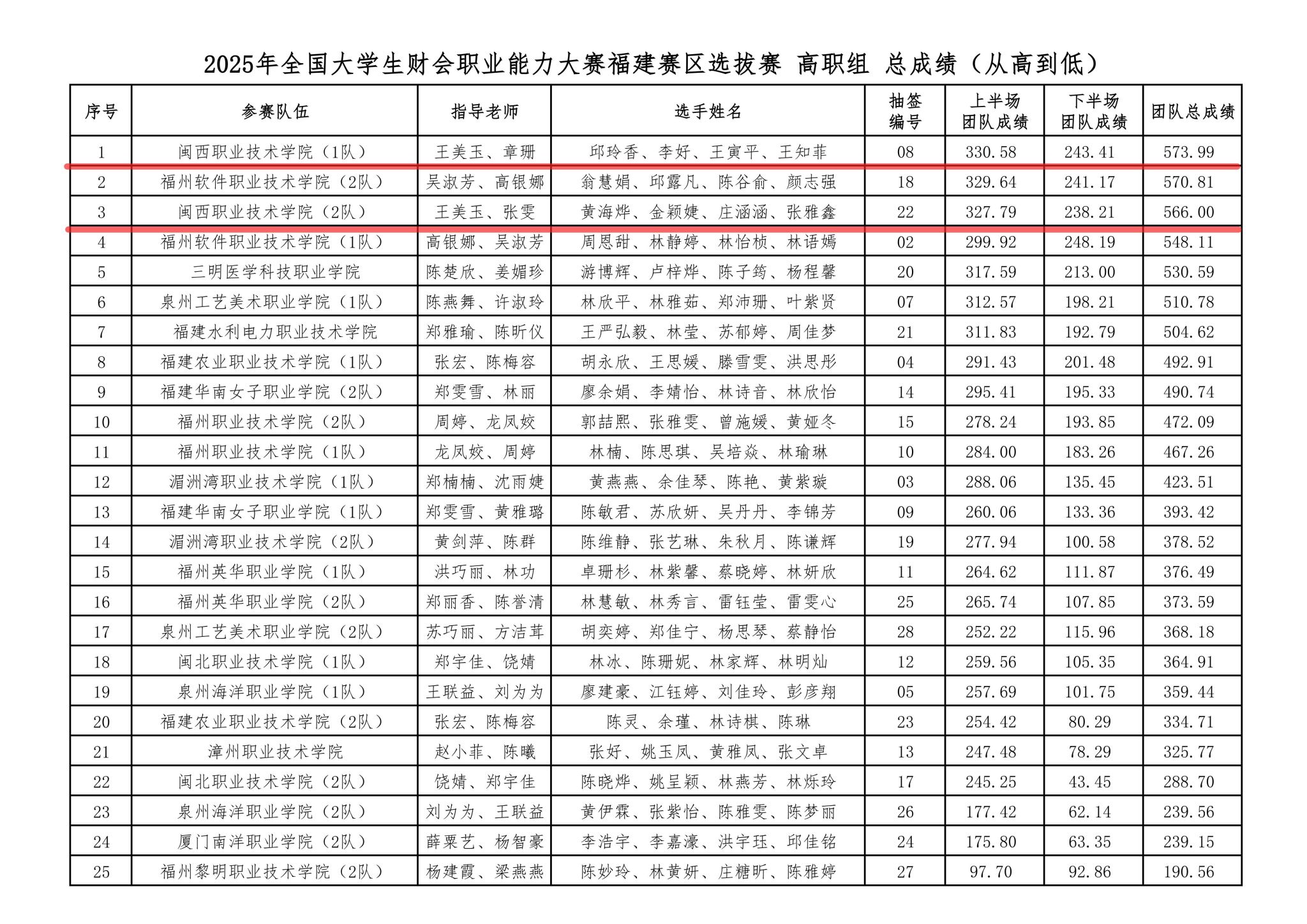 2025年11月2日,由福建省教育厅主办并由福州大学承办的2025年全国大学生财会职业能力大赛福建赛区选拔赛在福州落幕。财经商贸学院两支代表队凭借扎实专业功底与出色团队协作,从全省16所高职院校28支代表队的激烈竞争中脱颖而出,分别斩获高职组第一名和第三名,彰显学院财会人才培养成效。