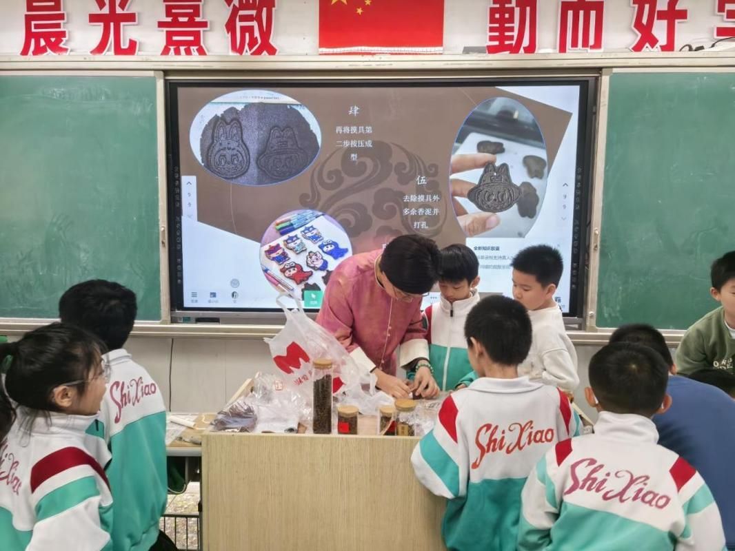 在手工实操环节,同学们在传承人与协助老师的细心指导下,动手揉泥、选模、塑形、脱模、系绳,一步步完成属于自己的香牌作品。造型各异的模具、清雅芬芳的香粉,让每一块香牌都承载着孩子们的巧思与喜悦。作品展示阶段,同学们踊跃分享创作心得,传承人逐一给予鼓励与点评,现场氛围温馨而热烈。