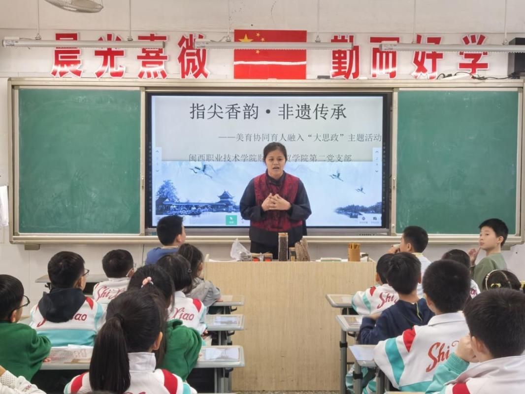 2025年12月5日下午,财经商贸学院团委与财经商贸学院第二党支部带领学院非遗传承团队,前往龙岩市实验小学开展“指尖香韵·非遗传承”美育协同育人主题活动。活动邀请非遗手工香牌传承人现场指导,让小学生在亲手制作中感受中华传统香文化的魅力,推动美育思政从高校向中小学延伸,助力大中小学思政教育一体化建设。
