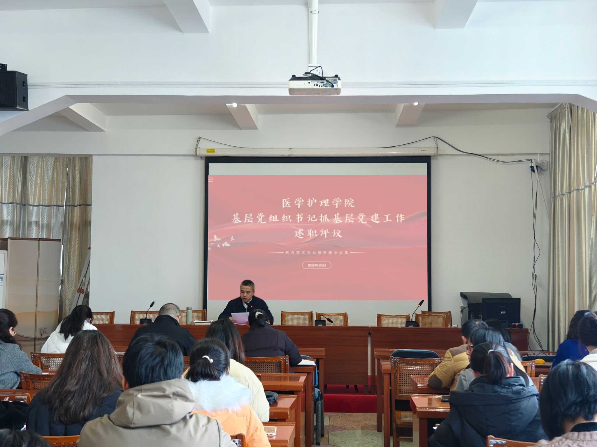 1月5日,医学护理学院在天马校区五楼会议室召开基层党组织书记抓基层党建工作述职评议会。学院全体党员出席会议,会议由学院党委书记邱伟彬主持。