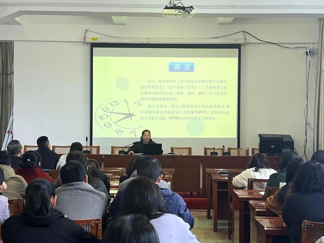 黄强华院长简要回顾寒假工作的进展及成效,并强调,新学期学院将重点围绕办学能力提升,紧扣“新双高”建设与升本目标,深化产教融合,落实“四全育人”,并带领全体教职工学习《关于深化职业教育教学关键要素改革的意见》。