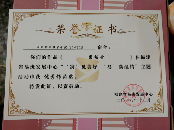 日前,我校组织各学生宿舍参加福建省易班发展中心“‘寓’见美好,‘易’满温情”主题活动。经过激烈的角逐,财经商贸学院18级电子商务(2)班14#715宿舍(成员:陈松萍、陈家慧、丁思洁、苏彩泓、苏欣茹、庄艳萍)的作品《团结舍》,获“优秀作品奖”。该作品为MG冰球参加本次活动的唯一获奖作品。此次活动加强了宿舍文化建设,提升宿舍文明水平,展现当代大学生创新意识及团队风貌。
