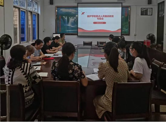 为落实学校党委全面从严治党的部署要求,抓实抓细日常监督,进一步提高重点人员的廉洁自律意识和拒腐防变能力,6月15日,医护学院组织召开重点人员集体廉政谈话会。会议由医护学院党委负责人主持,医护学院党政领导班子成员、专业主任及团委书记等重点人员参加会议。