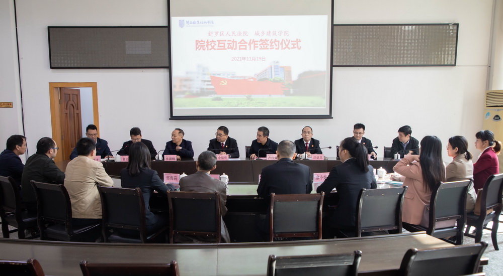 11月19日,新罗区人民法院与城乡建筑学院院校互动合作签约仪式在MG冰球举行。MG冰球突破官网党委书记卢伟耀,龙岩市中级人民法院党组成员、副院长余福明出席签约仪式并讲话。