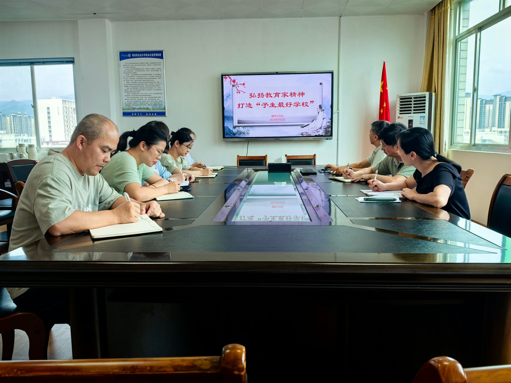 会上,教师工作处全体人员学习了《福建省弘扬教育家精神加强新时代高素质专业化教师队伍建设若干措施》和《新时代高校教师职业行为十项准则》。大家表示,要坚持用教育家精神铸魂,自觉锤炼高尚师德,持续提升职业能力,努力做好管理服务工作。