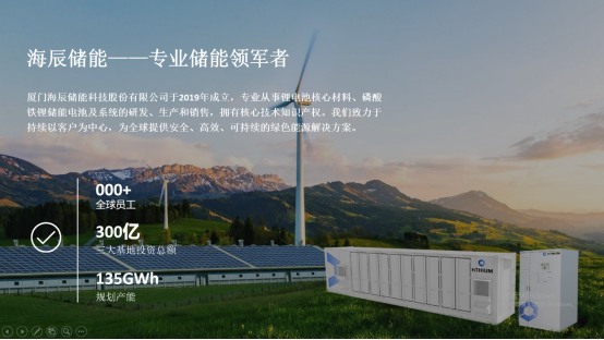 厦门海辰储能科技股份有限公司(简称海辰储能)成立于2019年,是福建省和厦门市双重点建设项目,入选厦门市“三高”和市重点工业企业。公司专业从事锂电池核心材料、磷酸铁锂储能电池及系统的研发、生产和销售,拥有研发人才超1000人,知识产权布局超1700项,已通过知识产权管理、IATF16949及ISO9001等体系认证。公司致力于持续以客户为中心,为全球提供安全、高效、清洁、可持续的绿色能源解决方案,打造全球储能电池第一品牌。