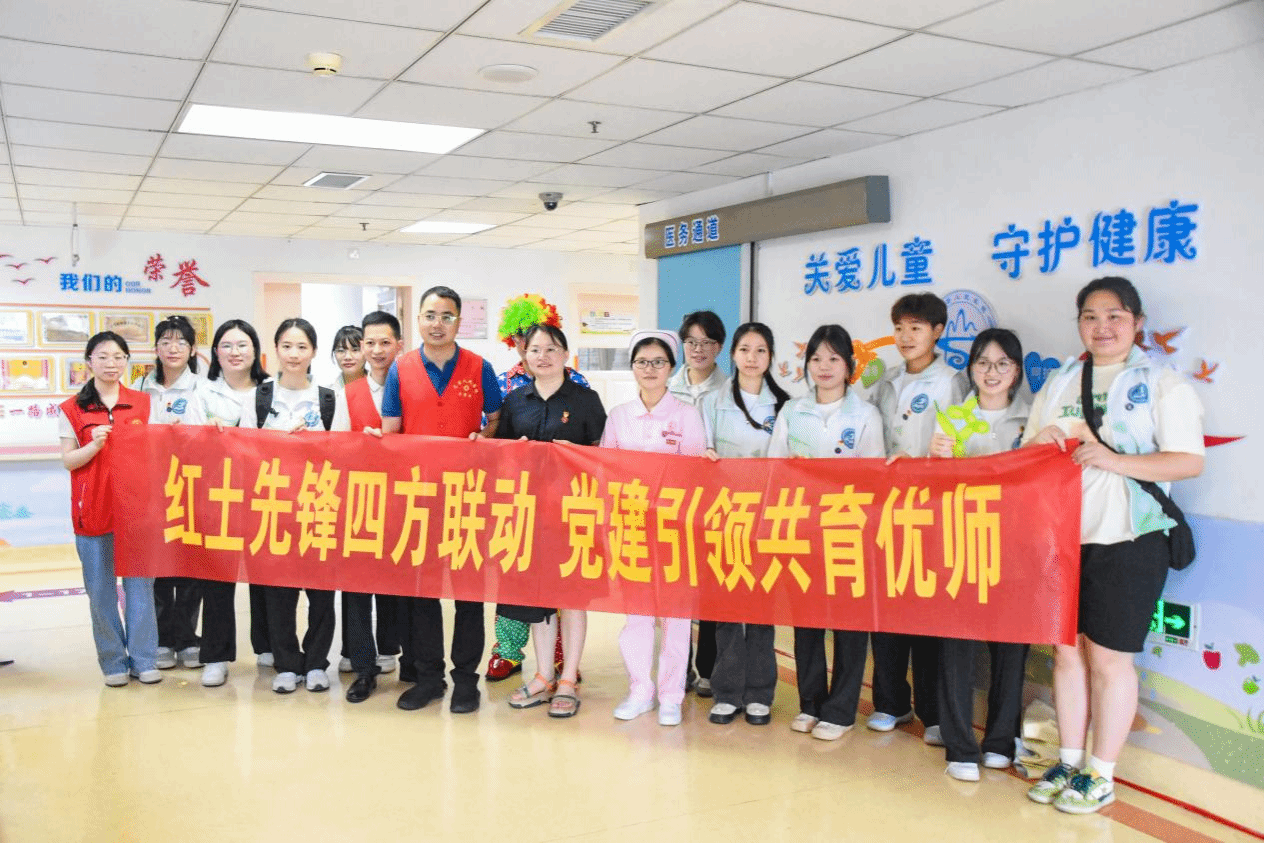 为营造温馨的“六一”国际儿童节气氛,让在医院的小朋友也能度过一个难忘的节日。2023年6月1日,教育与艺术学院第一党支部在龙岩人民医院儿保科开展了党建创新项目——“红土先锋四方联动,党建引领共育优师”党建志愿服务活动。
