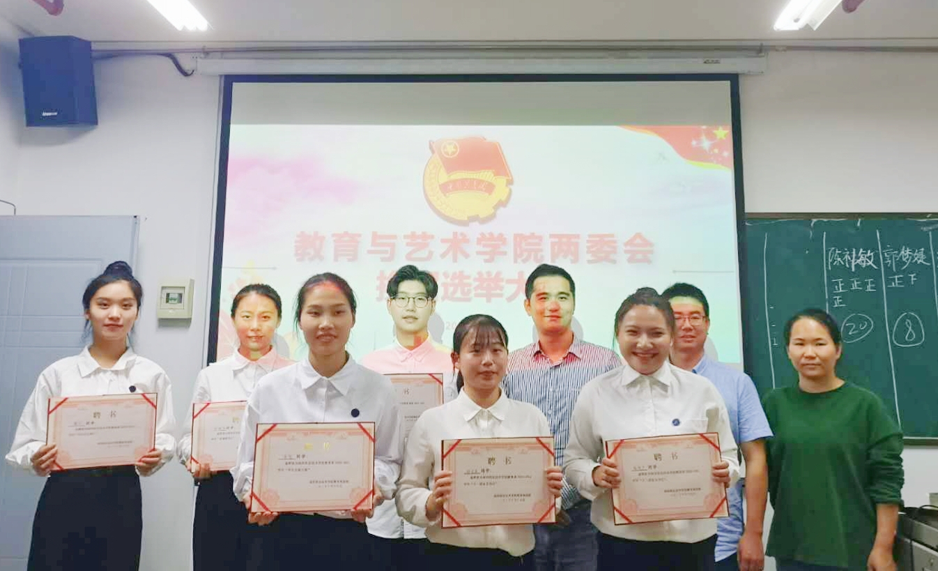 2020年10月19日和10月23日,教育与艺术学院分别进行第一届两委“主席团”和“部门干部”换届选举大会。学院党总支副书记曹熠城老师、团委书记邹寅将老师、辅导员胡丹老师、陈玲老师、刘观金老师,两委学生干部干事、班级代表参会。
