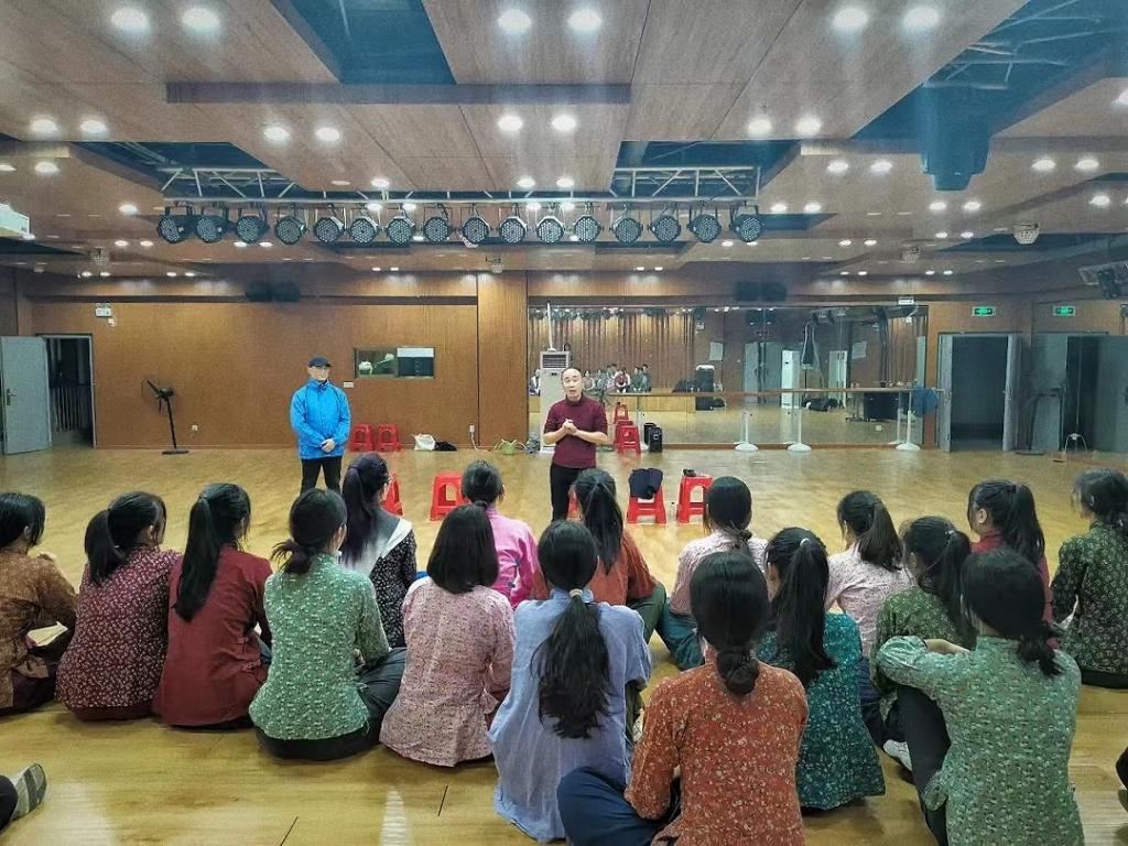 2022年4月20日,龙岩山歌戏传习中心谢旺兴、顾克、张兴艳、温钰秀四位老师利用晚上时间到我院为学生近期排演的山歌戏《红嫲》节选片段进行现场指导,为同学们讲解剧目历史背景、讲解分析角色人物。