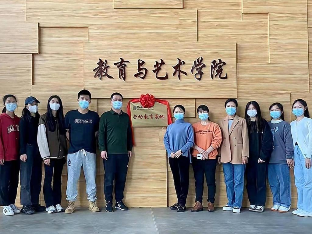 2022年3月30日,教育与艺术学院在教学综合大楼一楼举行“劳动教育基地”揭牌仪式。参加揭牌仪式的有院党委副书记曹熠城老师、院团委书记钱雪梅老师、实训室管理员张彩露老师、辅导员黄磊老师、刘观金老师及学生骨干们。