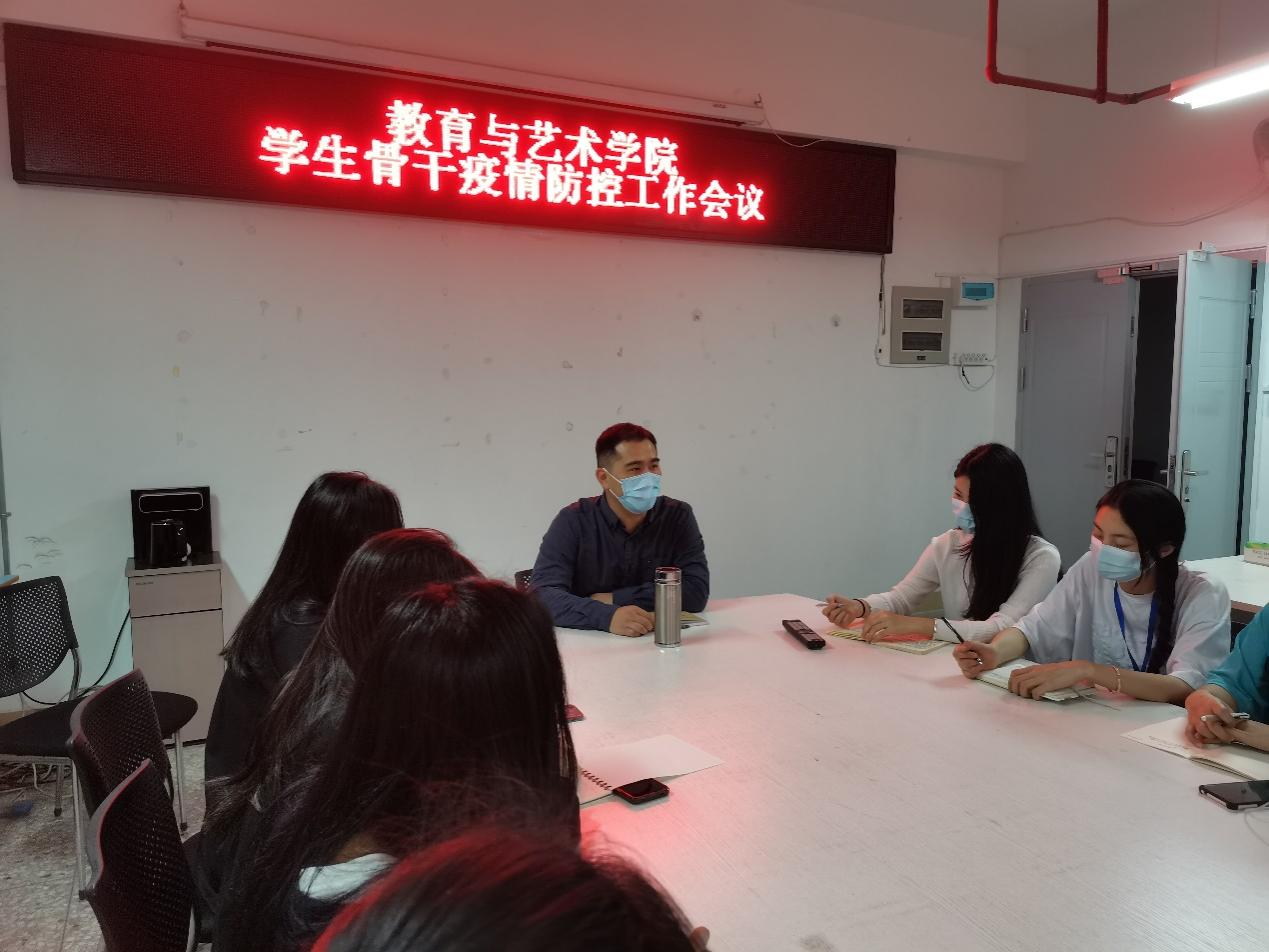 2022年3月20日,教育与艺术学院在教学综合大楼810会议室召开学生骨干疫情防控工作会议,出席此次会议的有学院领导和学生骨干。