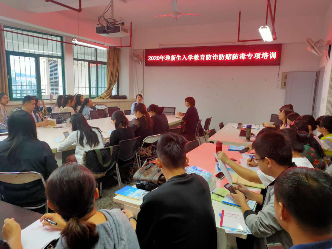 2020年10月7日下午,教育与艺术学院在教学综合楼八楼会议室召开2020年入学教育防诈防毒专项培训会议,龙岩市江山派出所教导员、红土公安警校老师吴冬云警官担任主讲,教育与艺术学院领导、全体训导师、辅导员、班主任及学生代表参加培训。