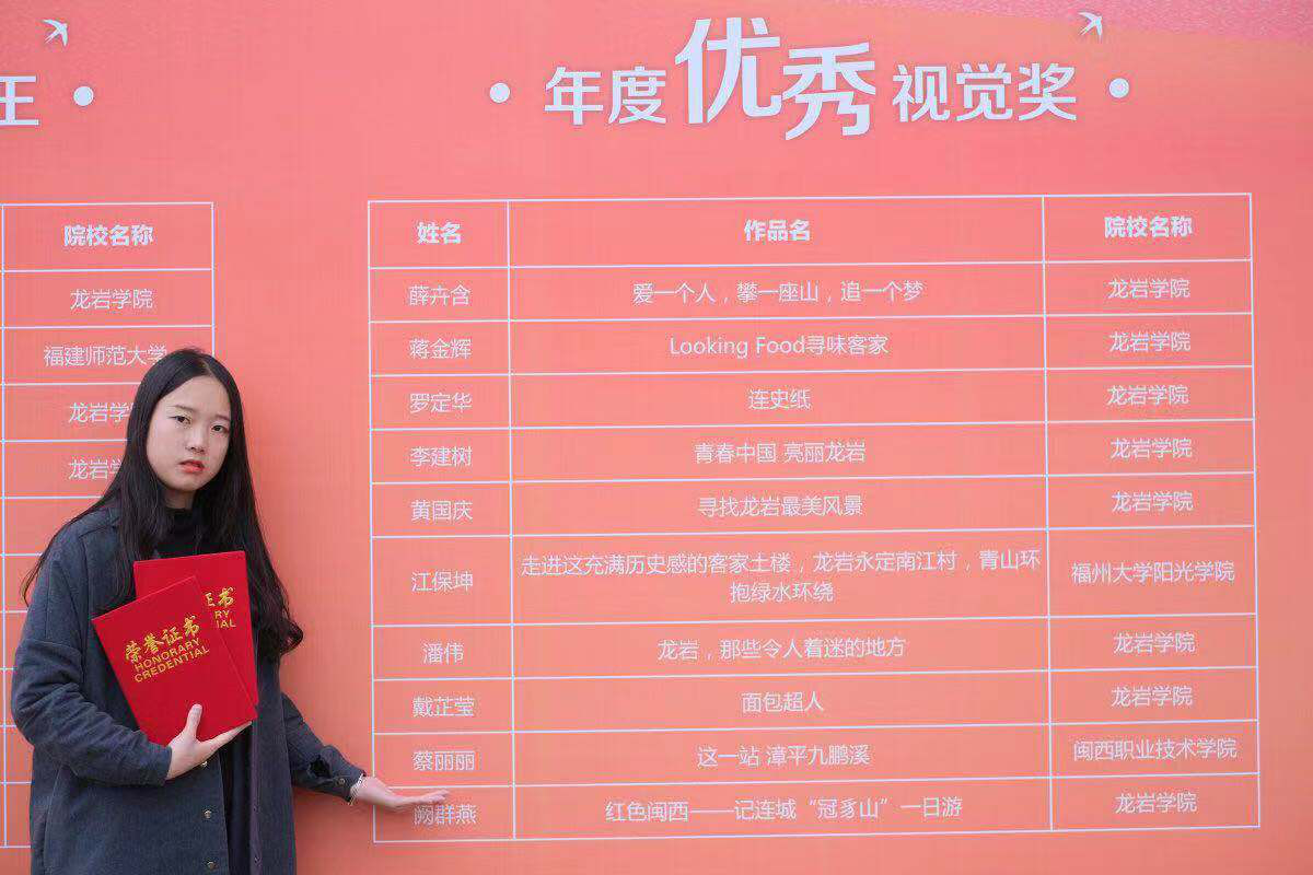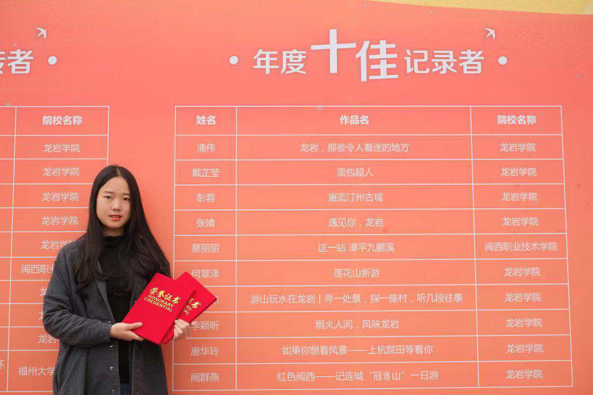 历时近四个月的“寻找龙岩大学生最美宣传者”活动进入尾声,MG冰球教育与艺术学院诞生龙岩最美宣传者。2017级学前教育专业蔡丽丽同学的作品《这一站,漳平九鹏溪》经过千件作品初选、复选、落地评选三个环节后,在此次活动中荣获“年度十佳记录者”和“年度优秀视觉奖”,同时2017级学前教育专业陈思琦同学也荣获本次活动的参与奖。