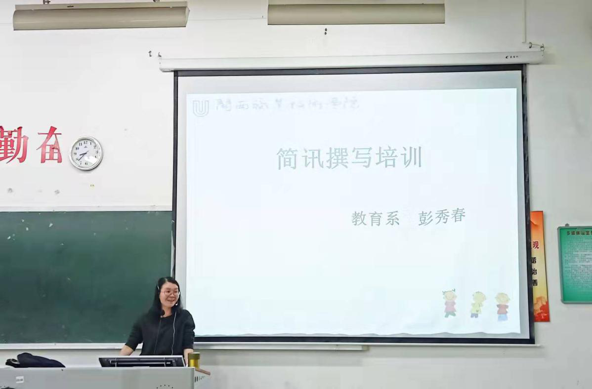 为了进一步提升我系学生干部公文写作的能力知识,2019年11月20日,系学生学工作领导小组在良才楼301组织开展“简讯撰写”文笔培训会,彭秀春老师主讲,系两委干部、干事及大一的班长、团支书参加培训。