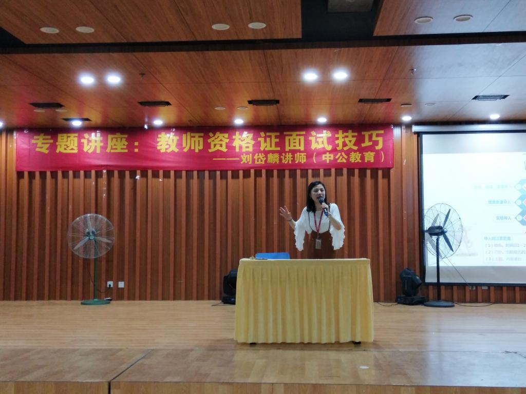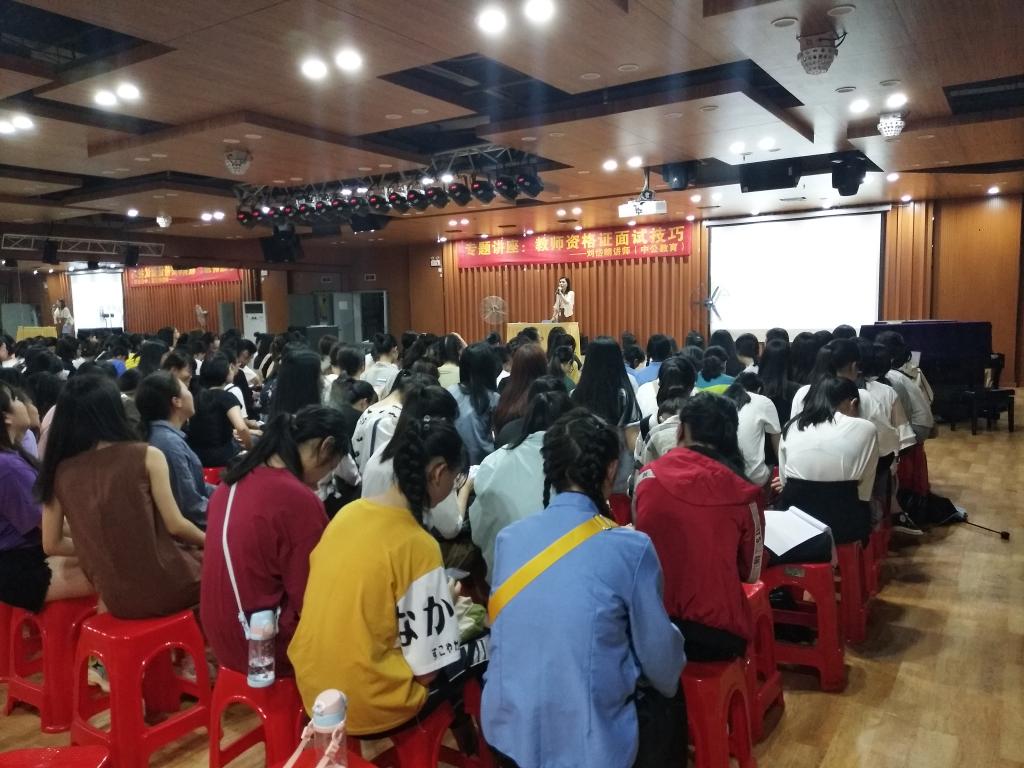 为加深同学们对教师资格证考试的了解,提高教师资格证考试通过率,2019年4月26日晚,我系邀请了龙岩市中公教育的刘岱麒讲师于教学综合大楼综合楼十楼开展了"教师资格证面试技巧"专题讲座,我系17、18级共350人参加此次讲座。