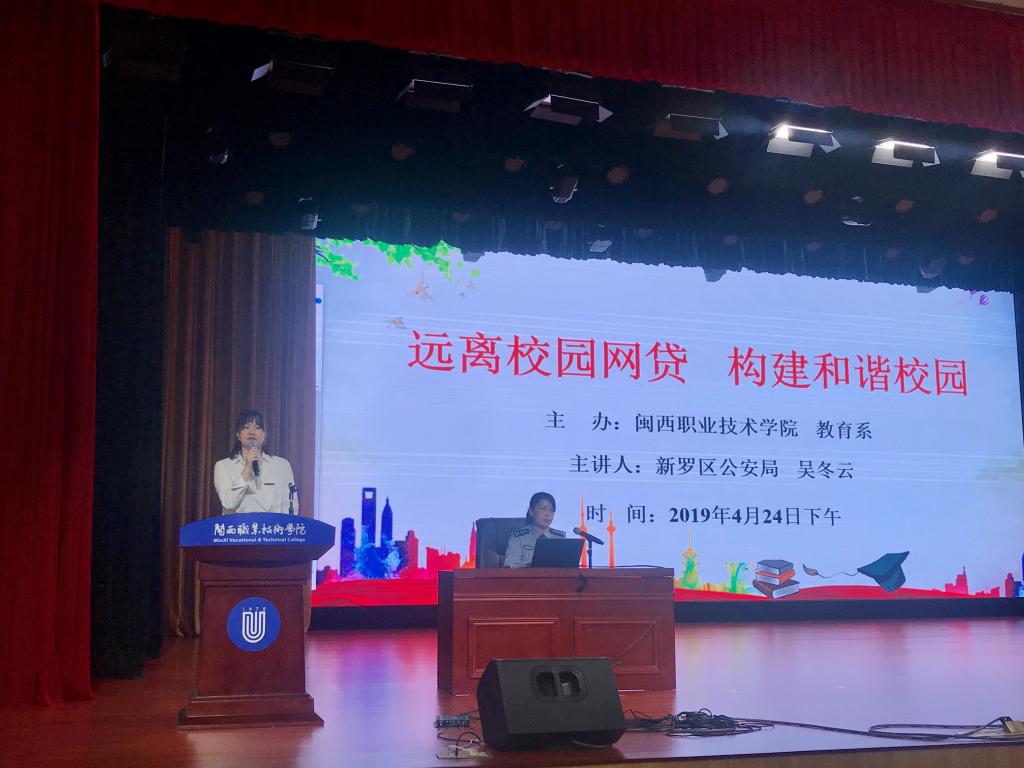 为防范不良校园网贷对在校大学生的侵害,进一步提升大学生网络借贷风险认识,增强金融、网络安全防范意识,树立正确的价值观和消费观。2019年4月24日下午3点,教育系邀请龙岩市公安局新罗区分局网络安全保卫大队的吴冬云讲师在大匠堂开展“远离校园贷构建和谐校园”专题讲座。教育系党总支书记连玲娜、党总支副书记杜谷文、团委书记邹寅将、全体辅导员以及17、18级全体学生共计600余人参加本次讲座,由教育系党总支书记连玲娜主持。