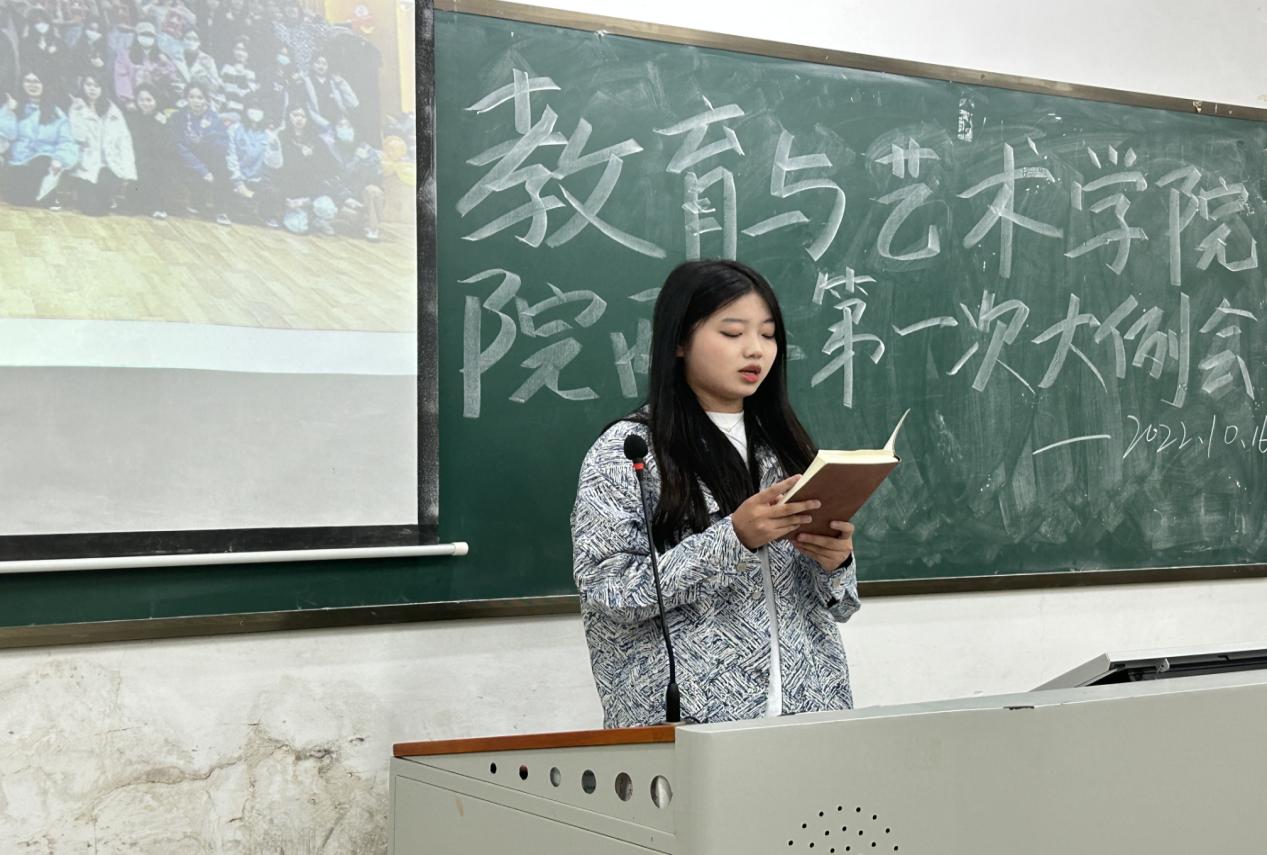 教育与艺术学院于2022年10月16日晚上7点在良才楼205开展院两委第一次大例会。出席此次会议的有团委副书记张雨珊、学生会主席彭丽媛、副主席陈婉婷、艺馨协会副会长林思妤,团总支与各部门正副部长以及22级新一任干事。