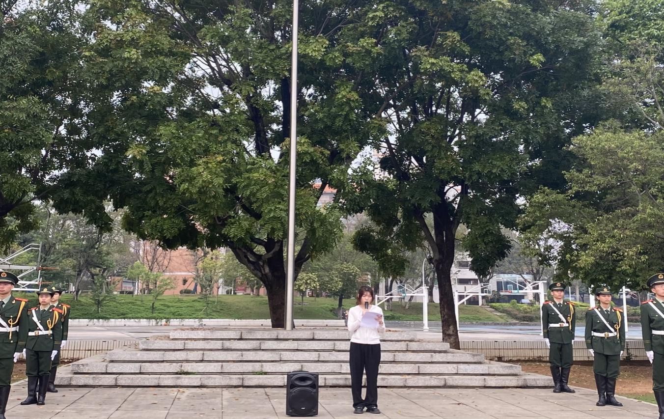 在升旗仪式中,校国旗护卫队队员身穿统一的制服,迈着整齐划一、铿锵有力的步伐,护送着五星红旗正步走向旗杆。国歌响起,全体同学行注目礼,五星红旗冉冉升起,在空中迎风飘扬。