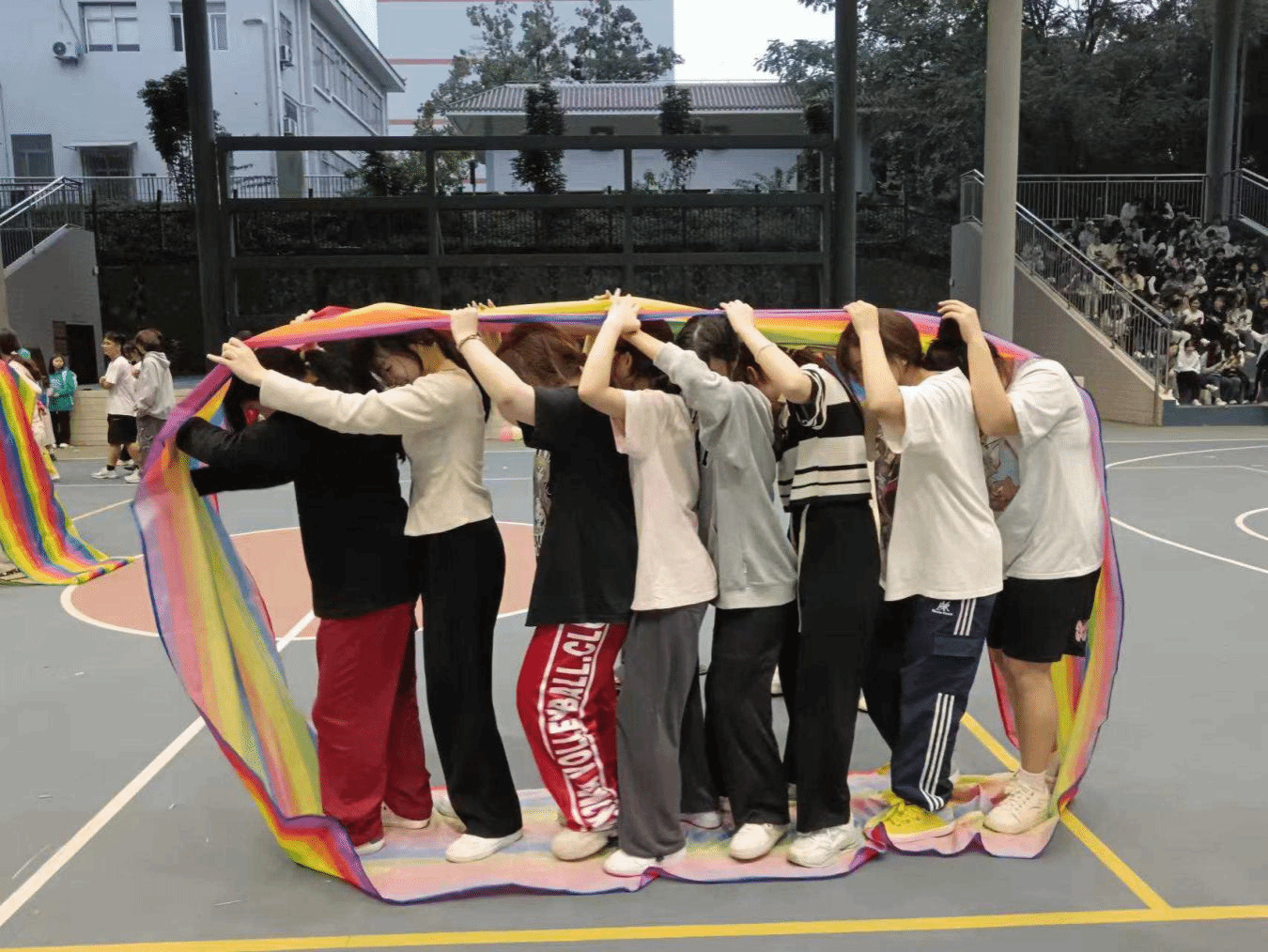 此次运动会由“踩气球大作战”“群龙取水”“螃蟹赛跑”“无敌风火轮”四个竞赛项目组成。比赛开始前由工作人员带领各班参赛人员做开场热身,欢快的音乐配上同学们热情的舞姿,现场热闹非凡。随着裁判哨声响起,运动会正式开始。运动员们在赛场上团结一致、奋勇拼搏,将团队配合精神展现的淋漓尽致。每一轮比赛都精彩激烈,现场充满欢声笑语。四个项目的精彩比拼展现出了运动员们之间的默契配合和团队协作能力。比赛结束后,工作人员为每位运动员送上微笑气球,同学们在气球上写下自己的愿望与美好祝福并合影留念。