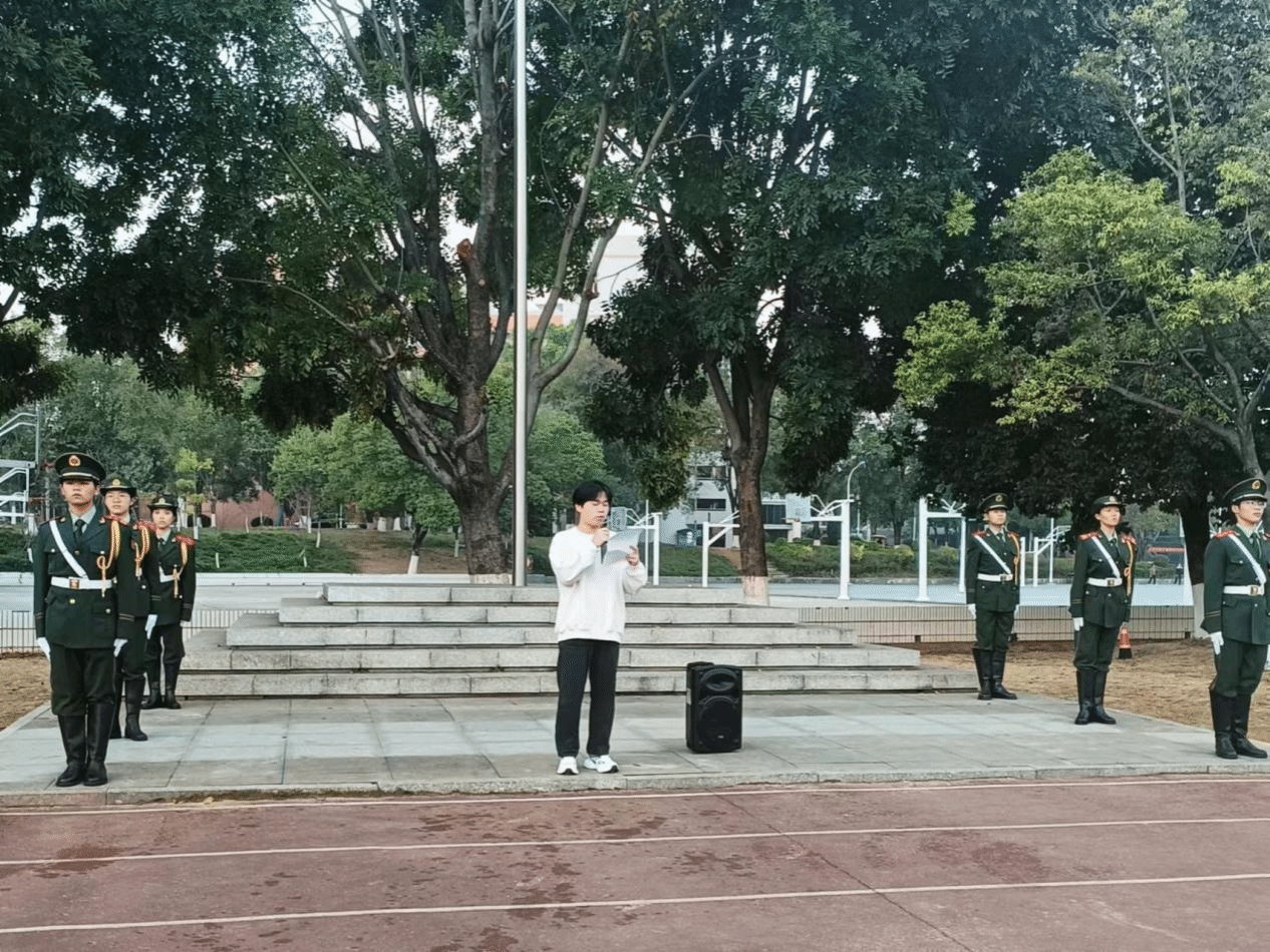 伴随着清晨的第一缕阳光,同学们陆陆续续到达了操场。井然有序地排列在操场上。在同学们的注视下,国旗护卫队迈着整齐划一的步伐护送国旗到达国旗台下,“奏国歌,升国旗,敬礼”,伴随着《义勇军进行曲》的响起,五星红旗冉冉升起,全体成员行注目礼。升旗结束后,教育与艺术学院学生代表郑志良同学做国旗下讲话,他以南京大屠杀为例,引用梁启超先生的话“历史的目的就是将过去的真实赋予新价值的意义,以供现代人之资鉴”来引出当代新青年应该要做到牢记历史,勇敢拼搏,时刻为实现中华民族伟大复兴贡献青春力量;以史为鉴,志存高远,忠于祖国,做一个具有远大思想和坚定信念的爱国主义者。少年智则国智,少年强则国强,身处新时代的我们更应该努力学习,以出众的专业本领建设更强大的中国。郑志良同学发言完毕后,升旗仪式到此结束。